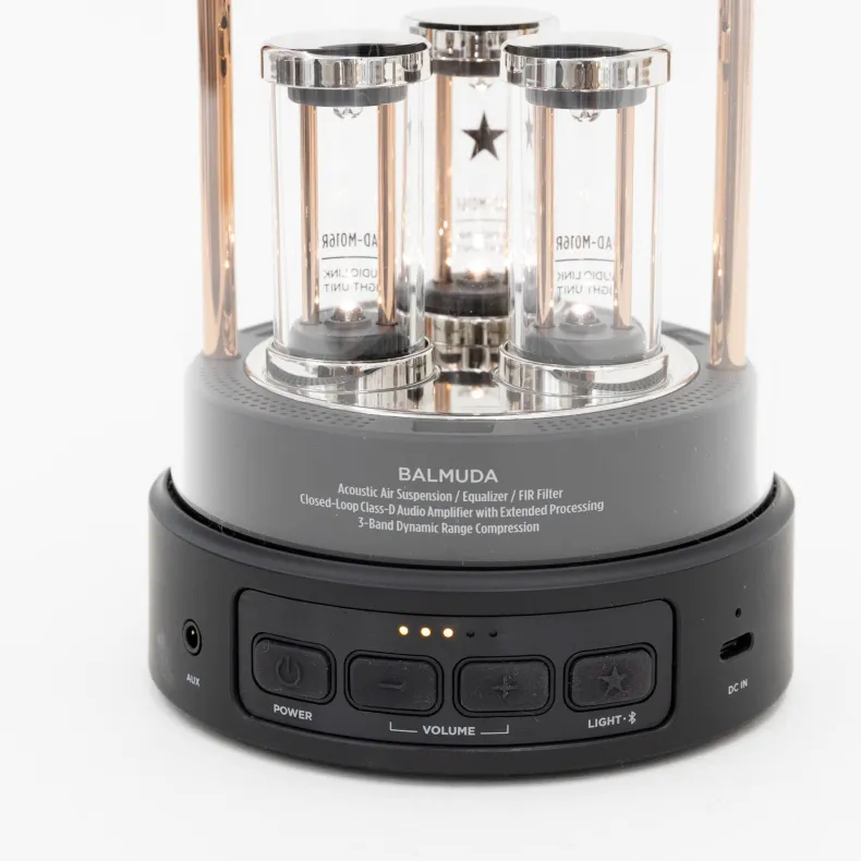 A portable, rechargable speaker with a crisp sound and modern look. The speaker features 360° omnidirectional high-quality acoustics for a crisp sound. The three iridescent inlaid LED tubes are meant to represent three band members performing on stage and synchronize with the music, glowing and pulsing with the mood and beat. An ode to his former days as a musician, BALMUDA’s founder wanted to create an immersive musical experience meant to emulate the feeling of live music. Compatible with both Bluetooth and auxillary cord. Type-C charger included.