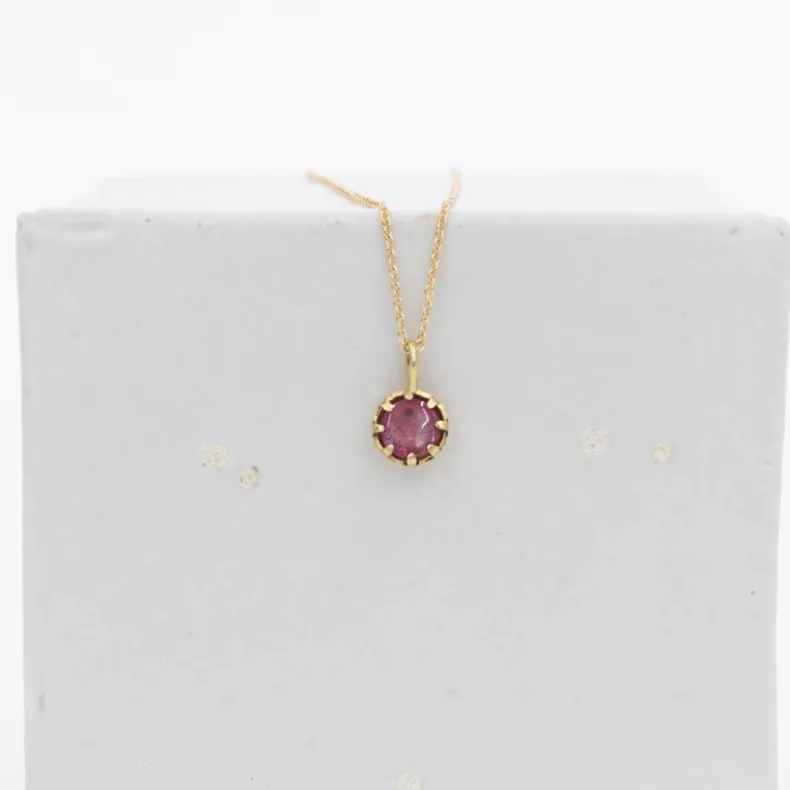 This double-sided pendant necklace features a pink tourmaline set inside an 18k yellow gold heart with a tiny sapphire set above the heart. The back reveals the other side of the tourmaline in a multi-pronged setting. Pink tourmaline is believed to represent a love of humanity and humanitarianism. Worn to promote sympathy towards others, it is an excellent stone for healers and counselors because it promotes better listening and understanding. It also carries the virtue of unconditional love and friendship.