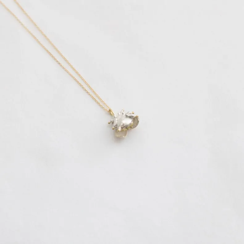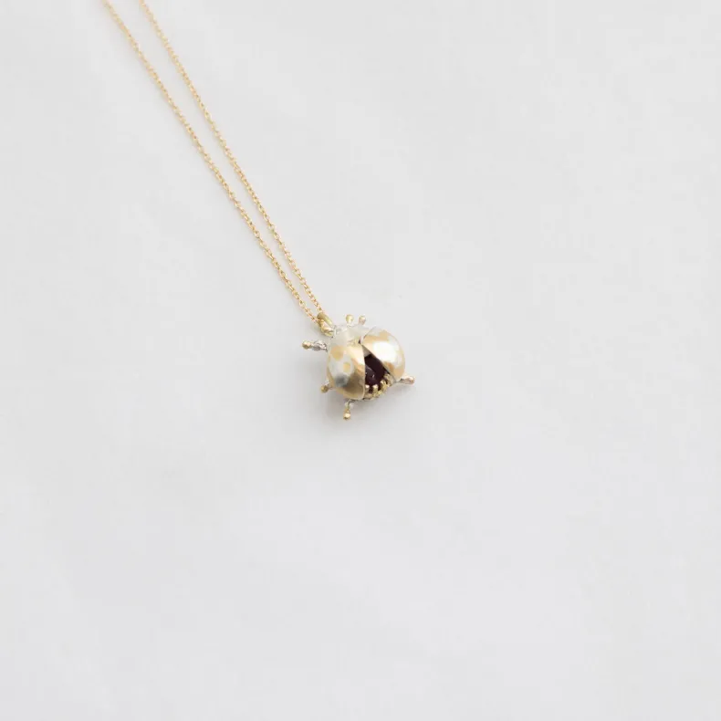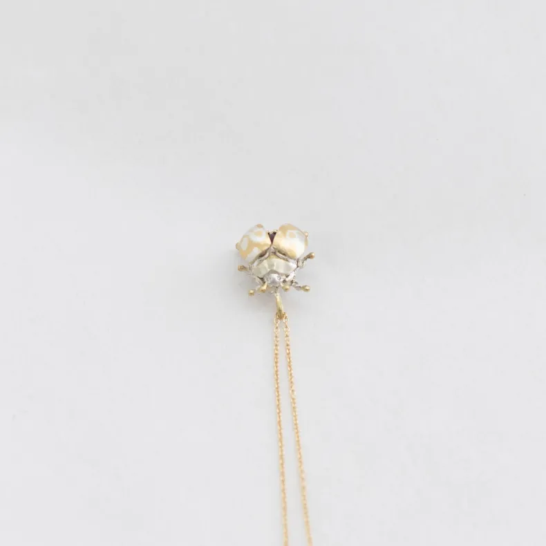 This pendant necklace features a red garnet set inside the wings of a ladybug and two little diamonds as its eyes. The ladybug’s body is made of a combination of 18k yellow gold and sterling silver using mokumegane, a traditional Japanese technique of mixing metals to produce a ‘wood grain’ alloy, and the wings open and close together.