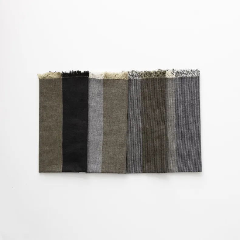 The F/Style tenugui are inspired by traditionally woven textiles in the town of Kameda, Niigata. Each cloth is printed with two colors. You can enjoy the balance of the green and grey tones together, or fold in such a way that only one color is visible. These cloths are used for countless purposes: as napkins, table runners, hand towels, hair accessories, gift wraps, face masks, etc. The edge of the thin cotton fabric helps the cloth dry quickly, and also adds a delicate and beautiful quality to this functional item.