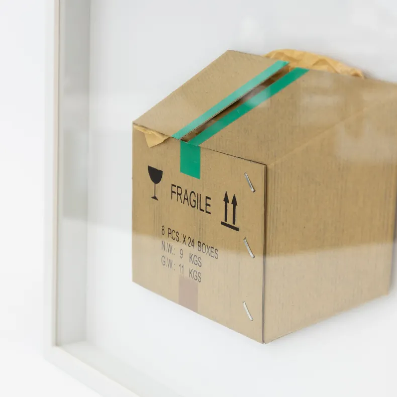 Somewhere between mass production and craft, Mitsuru Koga’s Flatwork Boxes deftly call attention to the subtle beauty of the corrugated box. Even though Koga’s boxes look manufactured, they are in fact created by hand with exacting precision. By screenprinting the box’s labels, barcodes and marks, and by making the tape himself, Koga takes the ordinary and makes it quietly extraordinary. Playing with this utilitarian aesthetic, each flatwork takes its inspiration from boxes traveling the world, accumulating scuffs and markings along the way. Each flatwork piece is signed with the artist’s signature and is displayed in a wooden frame and acrylic.