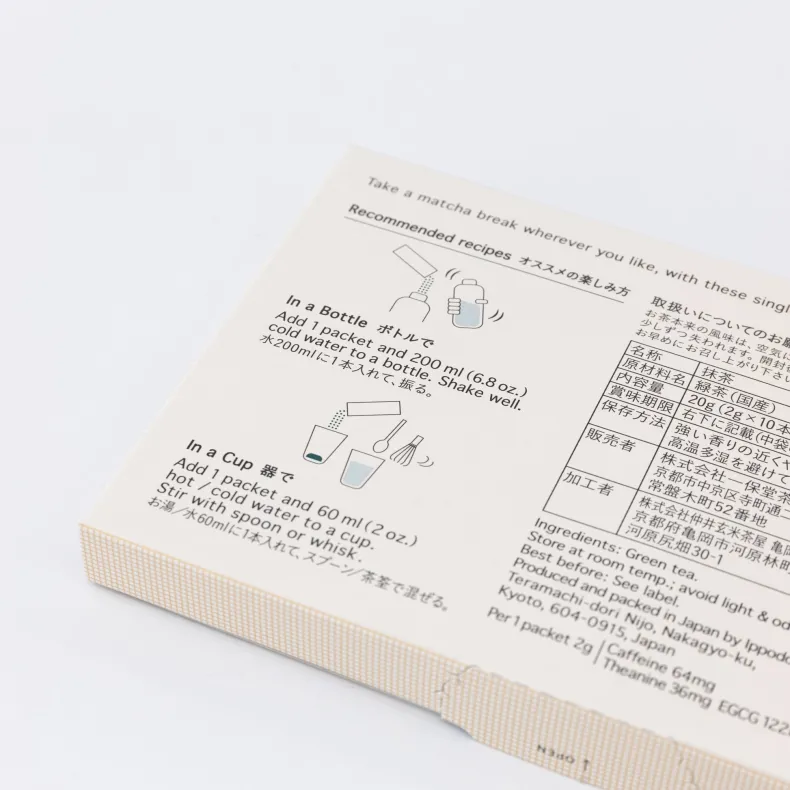 Authentic matcha conveniently packaged into single-serving portions, these are great for taking matcha on-the-go everywhere. Simply mix with water, iced or hot. Contains a medium-bodied, balanced matcha blend.