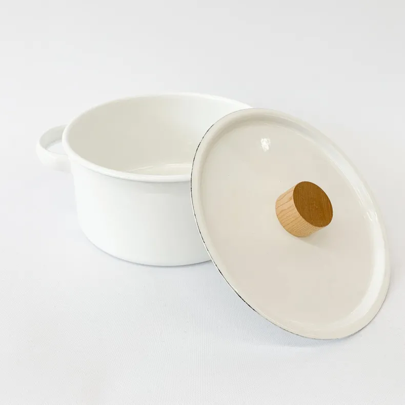 Durable and thermal efficient, this short pot is made of enamel coated steel so you can quickly cook its contents. The wood handle on the lid means your hands are safe when you go to grab it from the stove. Enamel coating prevents rust and is effective at evenly distributing heat, however it does requires special care – please read below under “Care Instructions” for more details!