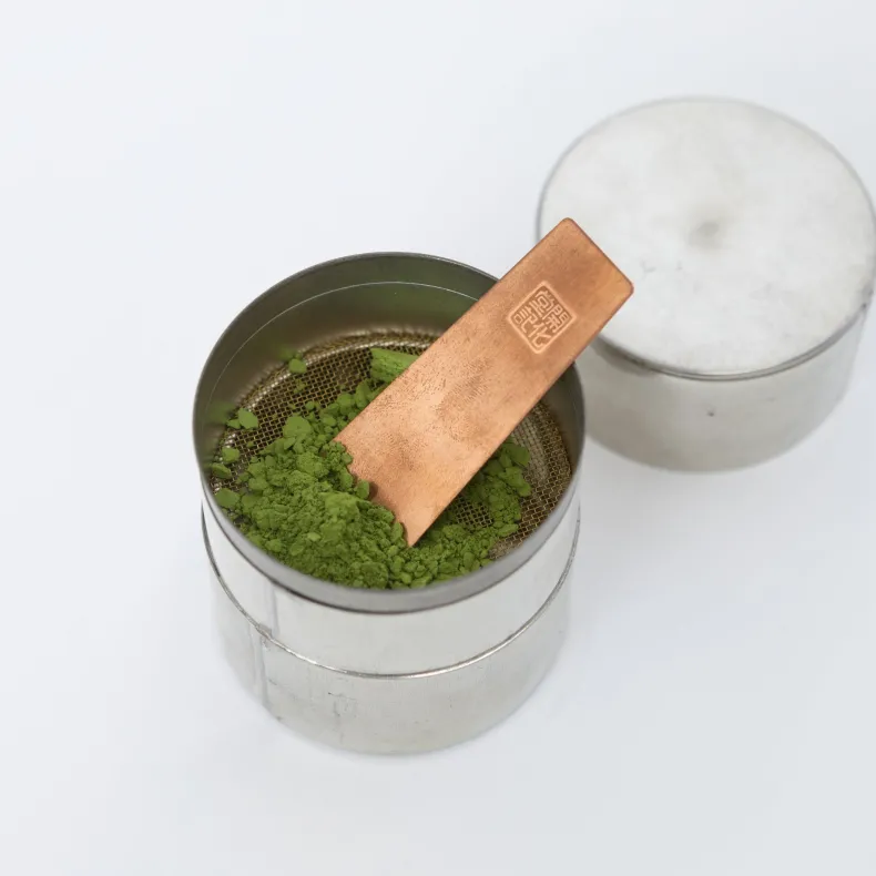 Specifically designed for matcha, this set includes a 40g canister, a tea scoop, a sieve, a container for the sieve, a spatula, and a sachet to carry the canister.