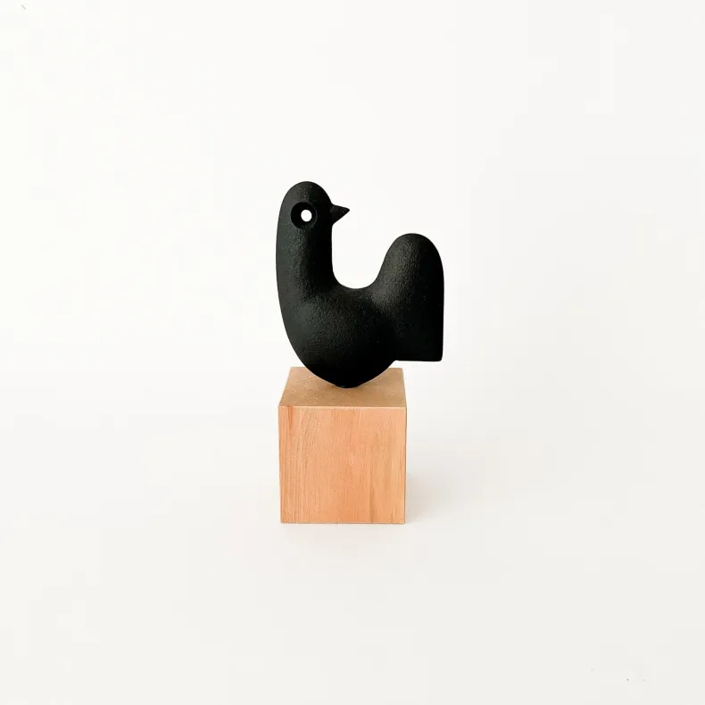 Interior designer Nobuho Miya is known for his functional cast iron cookware as well as this series of decorative animals sculptures. The iron bird series reveal Scandinavian influences Miya absorbed while living in Finland. Due to the bird’s minimal yet evocative aesthetic, this piece will be at home in any modern interior. Each cast iron bird rests on a wooden block, and is finished with an urushi (Japanese lacquer) coat for a rich black that is resistant to rust.