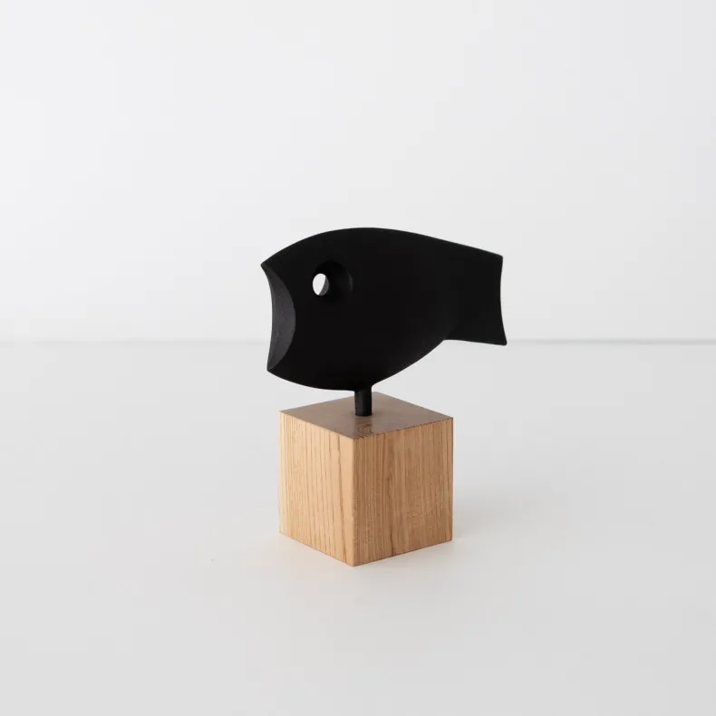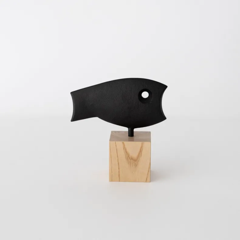 Interior designer Nobuho Miya is known for his functional cast iron cookware as well as his series of cast iron animal sculptures, including the fish featured here. Its minimal yet expressive design will be at home in any modern interior. Use as a paper weight or decorative sculpture. The Nambu Tekki cast iron, one of the officially certified traditional crafts of Japan, is finished with a coat of urushi (Japanese lacquer) for a rich black that is resistant to rust.