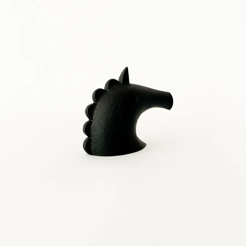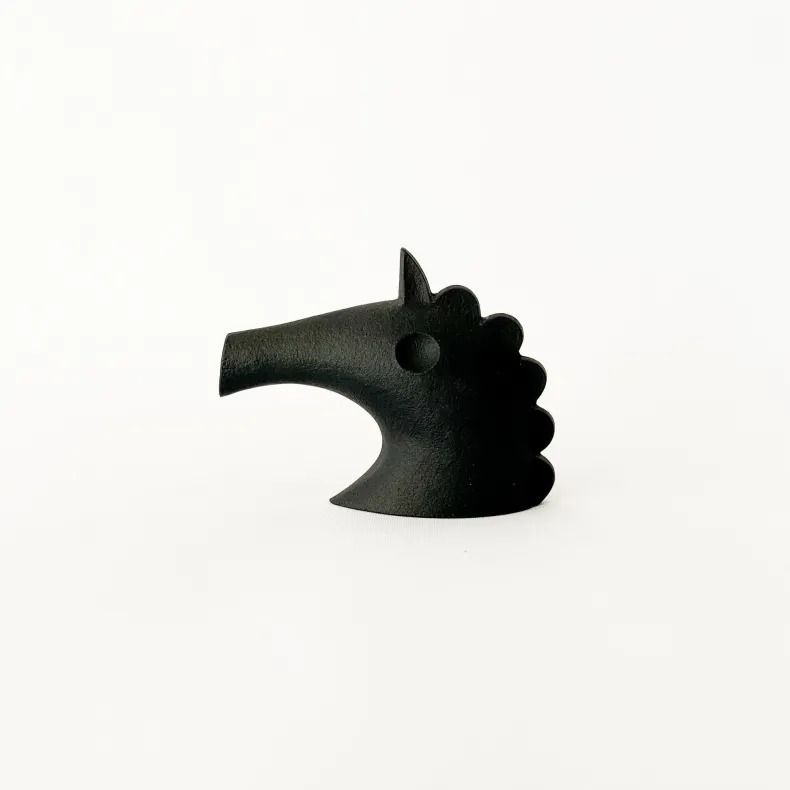 Interior designer Nobuho Miya is known for his functional cast iron cookware as well as this series of decorative animals sculptures. The Iron Seahorse represents an innovation in the nambu tetsu (cast iron) tradition by combining art and design into one piece. This traditionally crafted iron seahorse can be used as a bookend, paperweight, or decorative sculptural object. Due to the seahorse’s minimal yet evocative aesthetic, this piece will be at home in any modern interior. Each cast iron horse is finished with an urushi (Japanese lacquer) coat for a rich black that is resistant to rust.