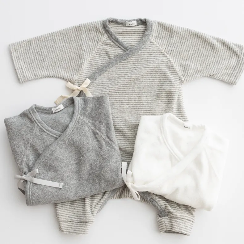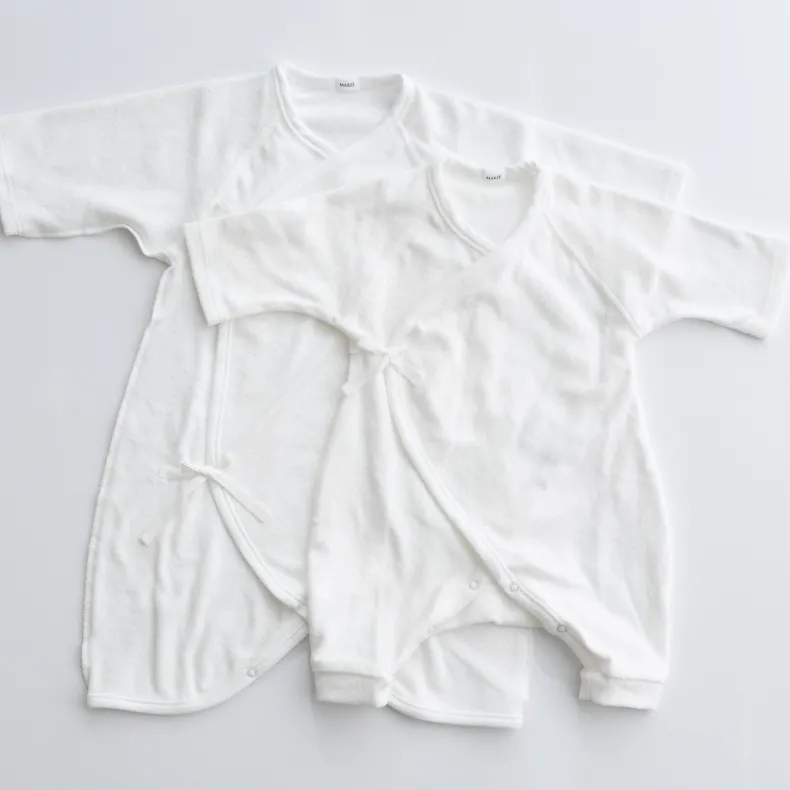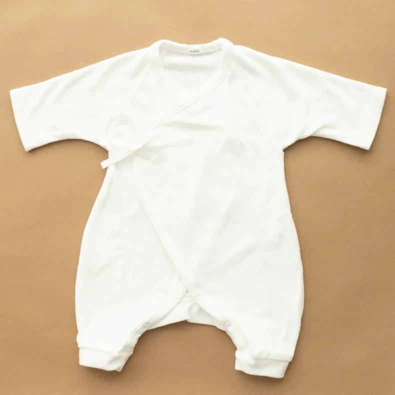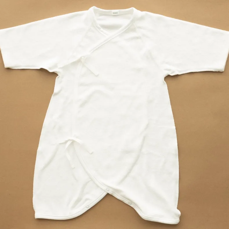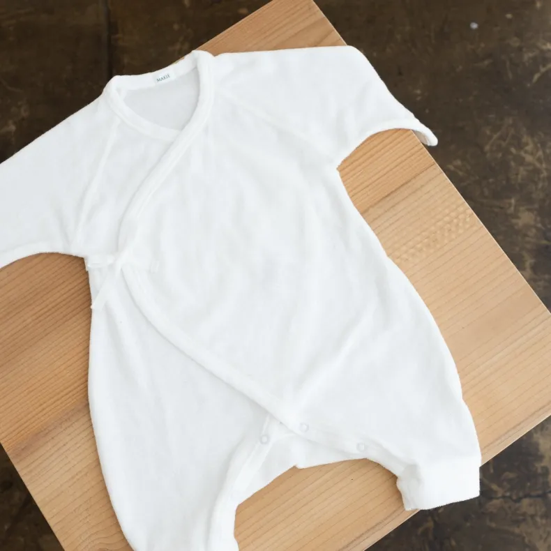 MAKIÉ’s First Hadagi is a classic Japanese baby onesie made from 100% cotton pile that is gentle on infants’ delicate skin. The hadagi’s minimalist design clothes babies of all genders. A kimono wrap side tie and snap closure in the crotch make for easy dressing and diaper changes.