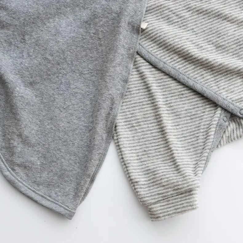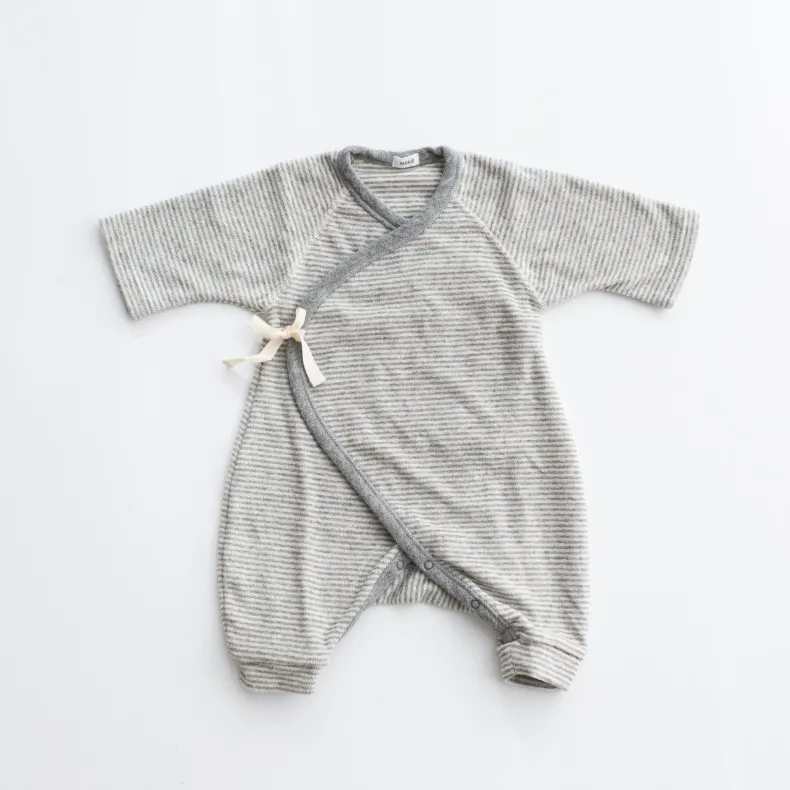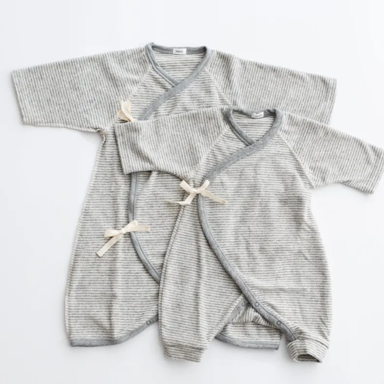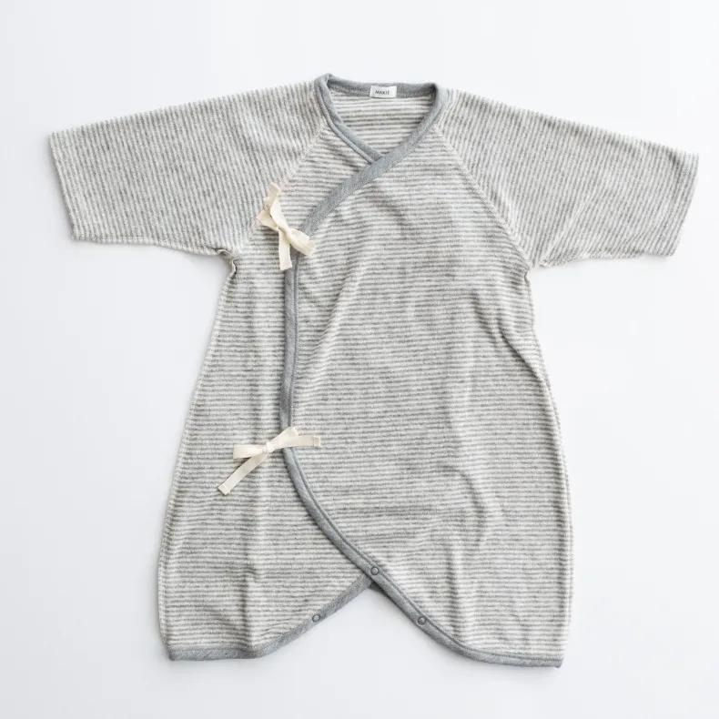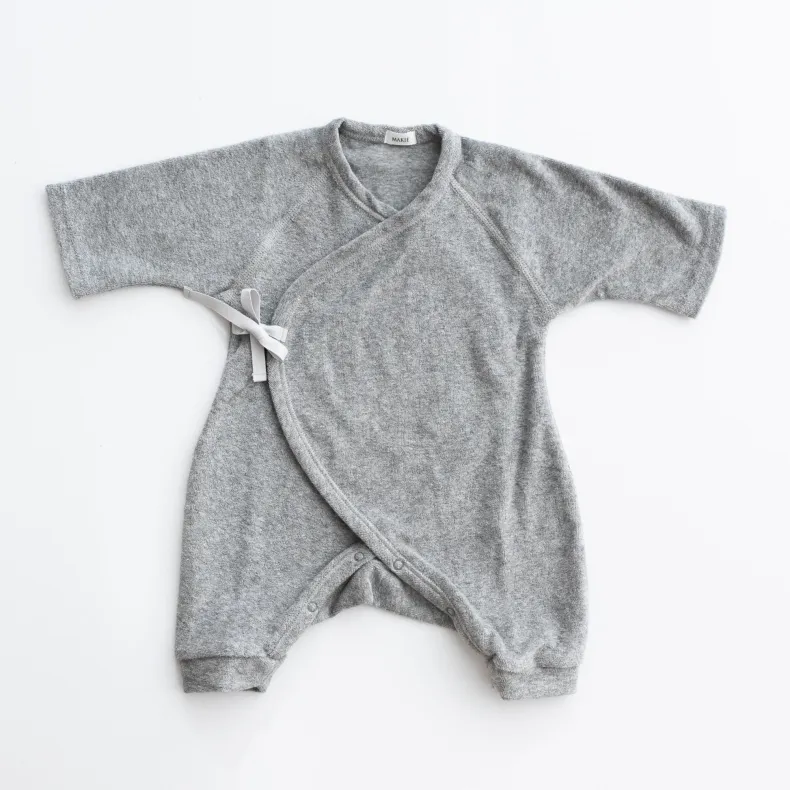 MAKIÉ’s First Hadagi is a classic Japanese baby onesie made from 100% cotton pile that is gentle on infants’ delicate skin. The hadagi’s minimalist design clothes babies of all genders. A kimono wrap side tie and snap closure in the crotch make for easy dressing and diaper changes.