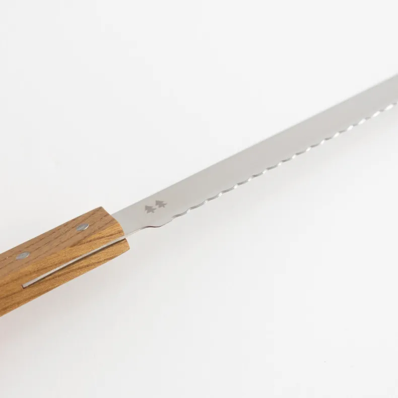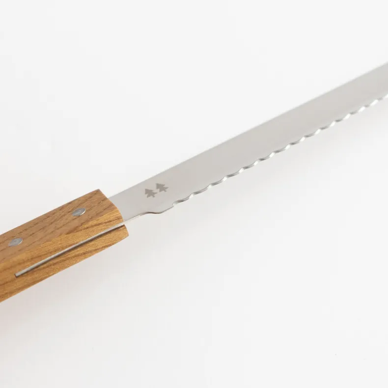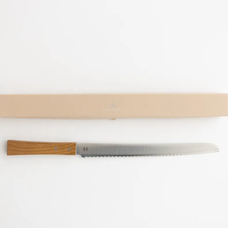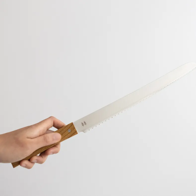 Each knife in the Morinoki series is lightweight and handmade with a design that balances functionality and warmth. The broad serrations on the Morinoki bread knife’s unique handcrafted blade become finer at the tip. Having two types of serrated edges allows for the knife to cut both hard and soft breads smoothly, creating beautifully thin slices with minimal crumbs. The stainless steel blade is set in a wood handle made out of Japanese zelkova, a tree often enjoyed as a bonsai. Detailed attention is given to creating the handle’s smooth, rectangular shape to ensurea comfortable grip.
