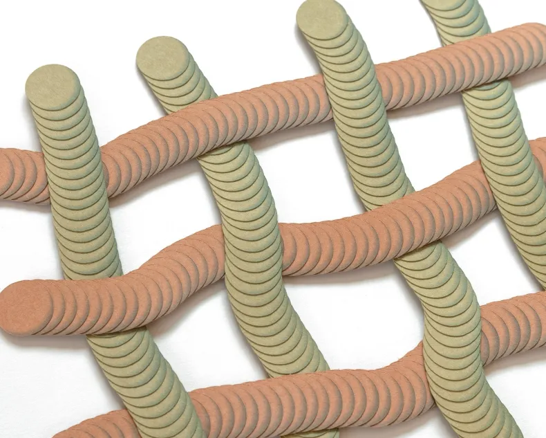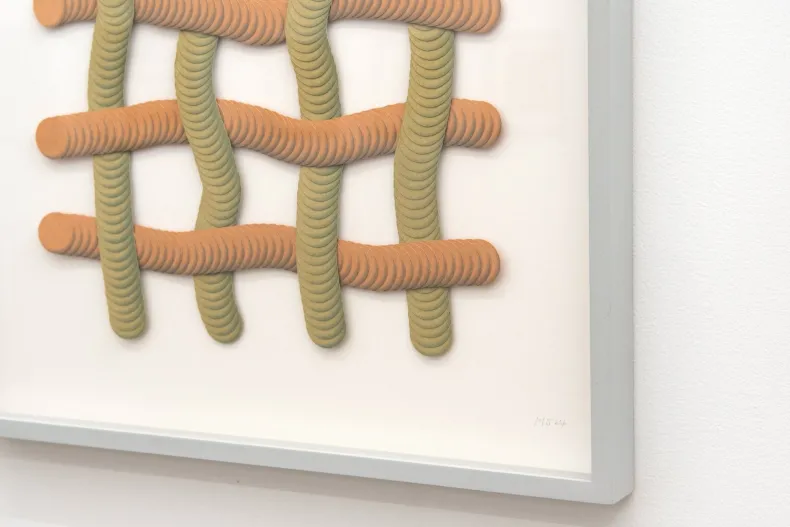 Suzuki’s artworks are carefully woven compositions of layered paper materials. Evoking a sense of movement and depth, the imbricated, intricate patterns dance between graphic design and textile art and are reminiscent of tapestries, nets, and baskets.