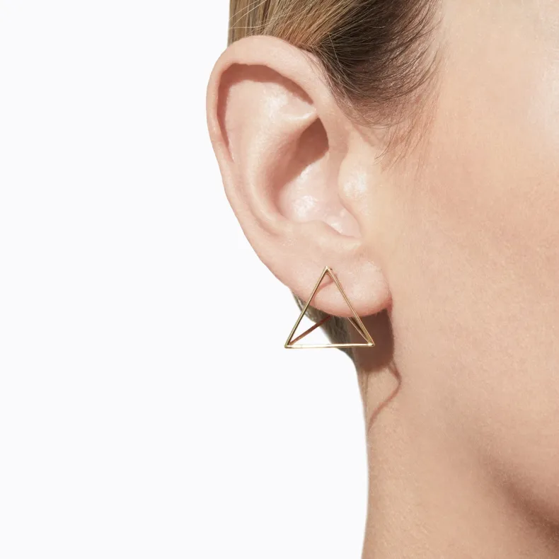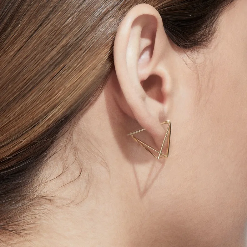A collection of three dimensional earrings. Clean geometric forms open up into wearable pieces of jewelry. One side is an earring post and appears to float seamlessly around the earlobe when worn.