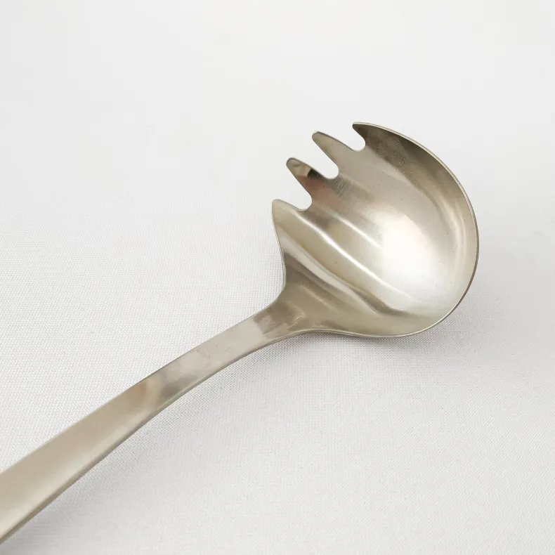 This stainless steelfork ladle is part of the Sori Yanagi Cooking Utensils line. This series of ergonomic tools won the Good Design Award in 1998. The curve of the handle provides a strong grip, and the fork feature makes this ladle perfect for noodle dishes or hotpots. Display the sleek, functional form on your wall by hanging the turner from the hole in its handle when not in use.