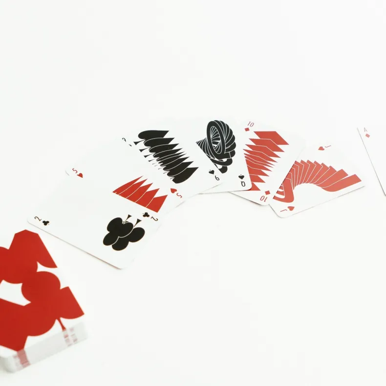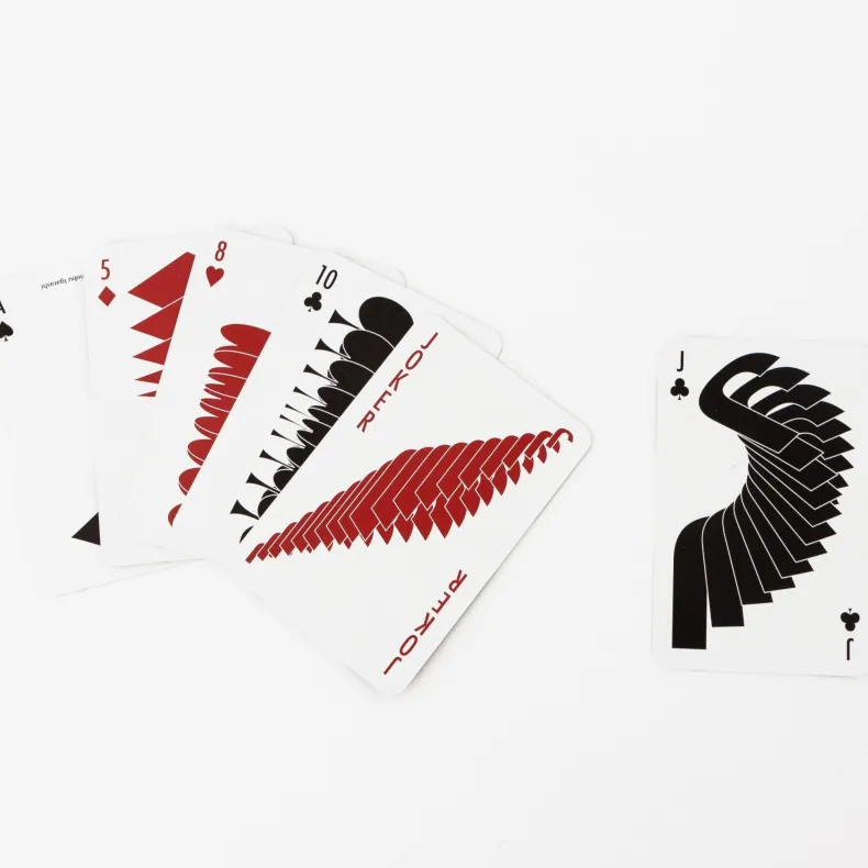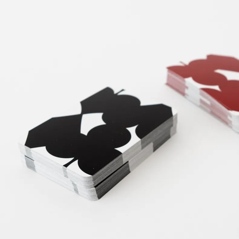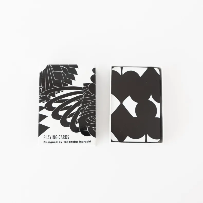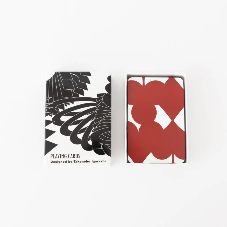 In the late 1980s, MoMA commissioned a deck of cards by graphic designer Takenobu Igarashi. First appearing in 1993, the cards reflect a contemporary sensibility. Breaking with convention, their symbols overlap and cascade on the front, a stark contrast to their isolated and flat treatment in traditional decks. On their uniform back, Igarashi plays with positive and negative space, merging the symbols of each suit in a two by two composition that bleeds off the cards’ edges. Printed in Austria.