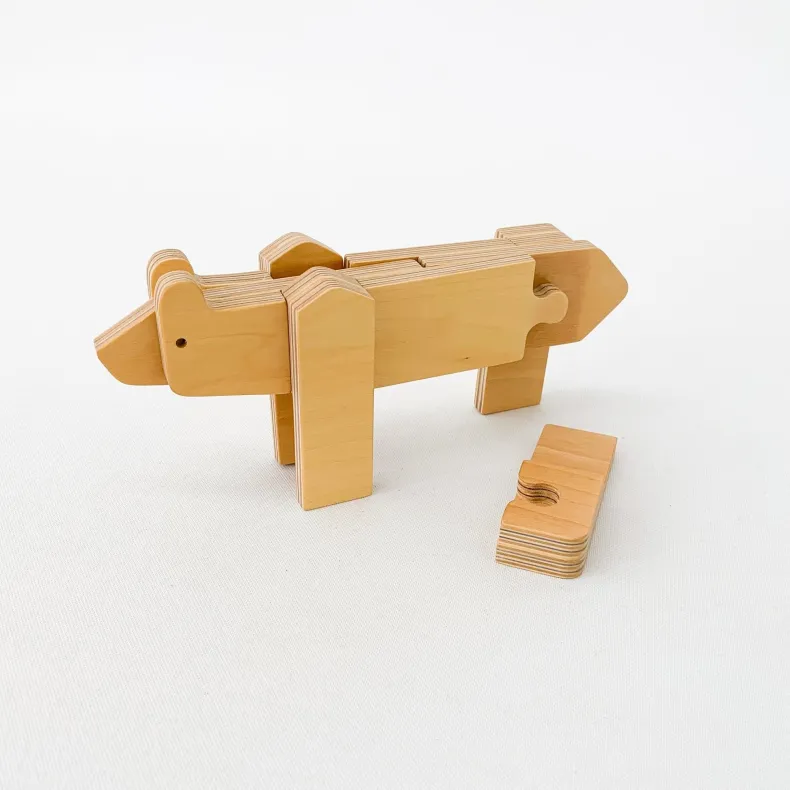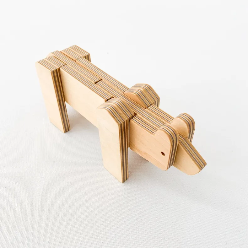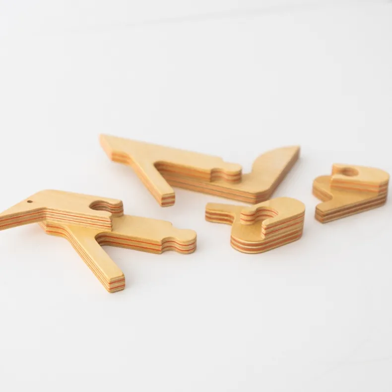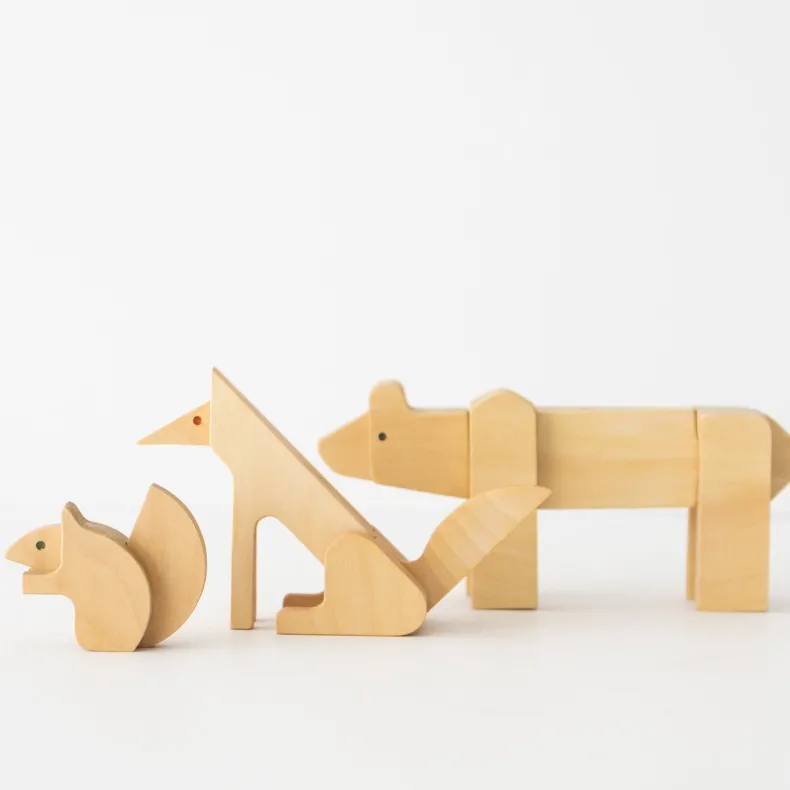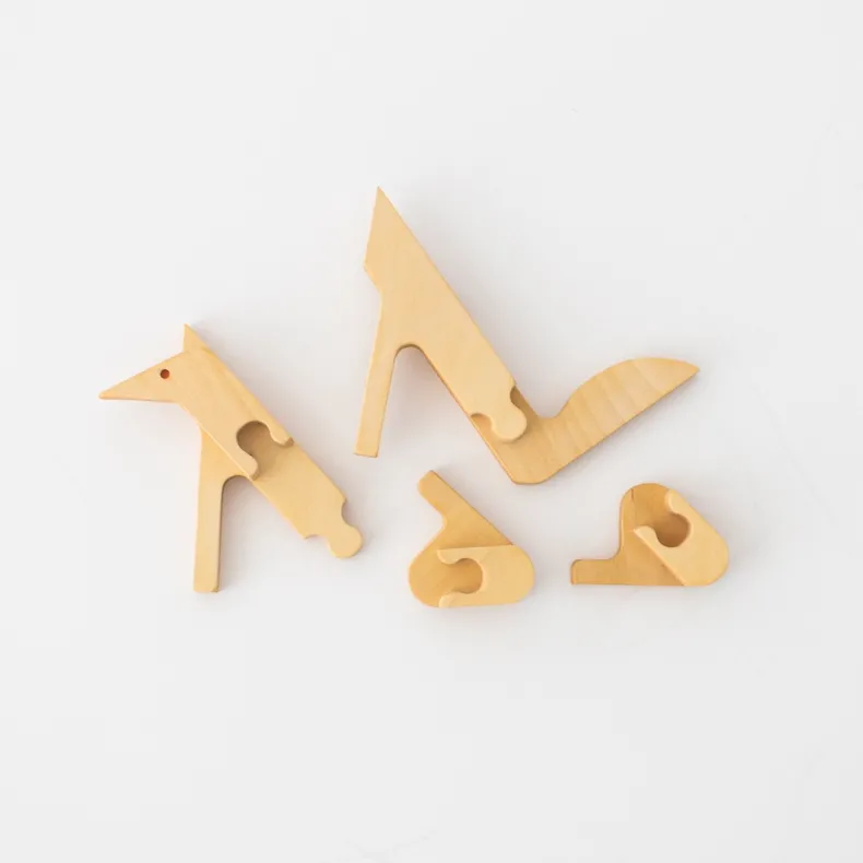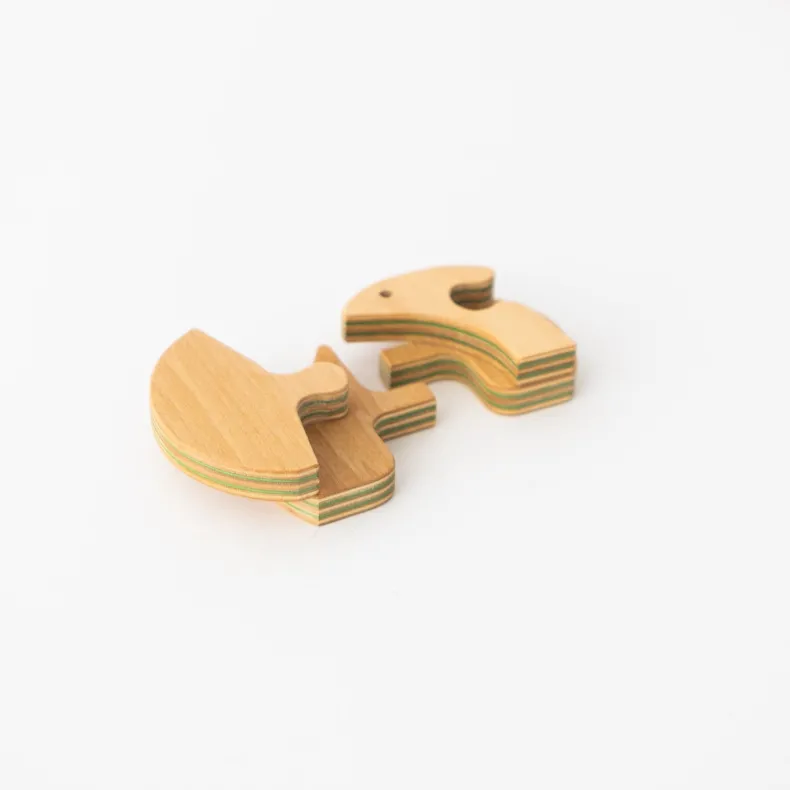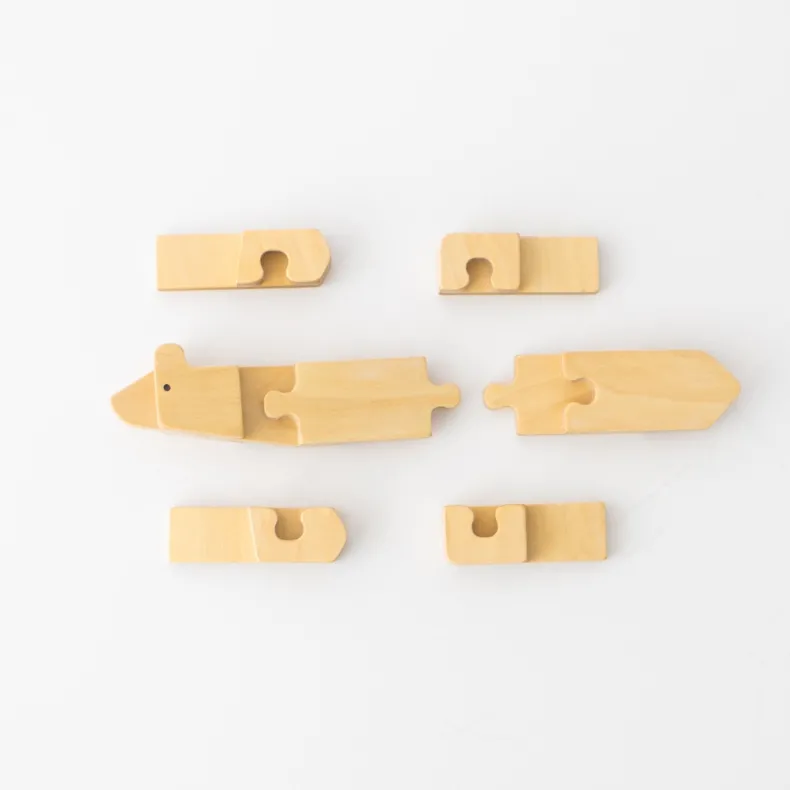 These 3D geometric jigsaw puzzles by Takizawa Plywood feature three forest animals native to Hokkaido: the Ussuri brown bear, the Ezo red fox and the Ezo Risu Hokkaido squirrel. The elegant and playful stripes at the edges of each piece reflect the alternating layers of colored recycled paper and wood veneer used in the plywood’s construction. Known as Paper-Wood, this innovative hybrid material was invented in Takizawa’s PLYWOOD laboratory in Hokkaido, the northernmost prefecture in Japan known for paper production and woodworking.