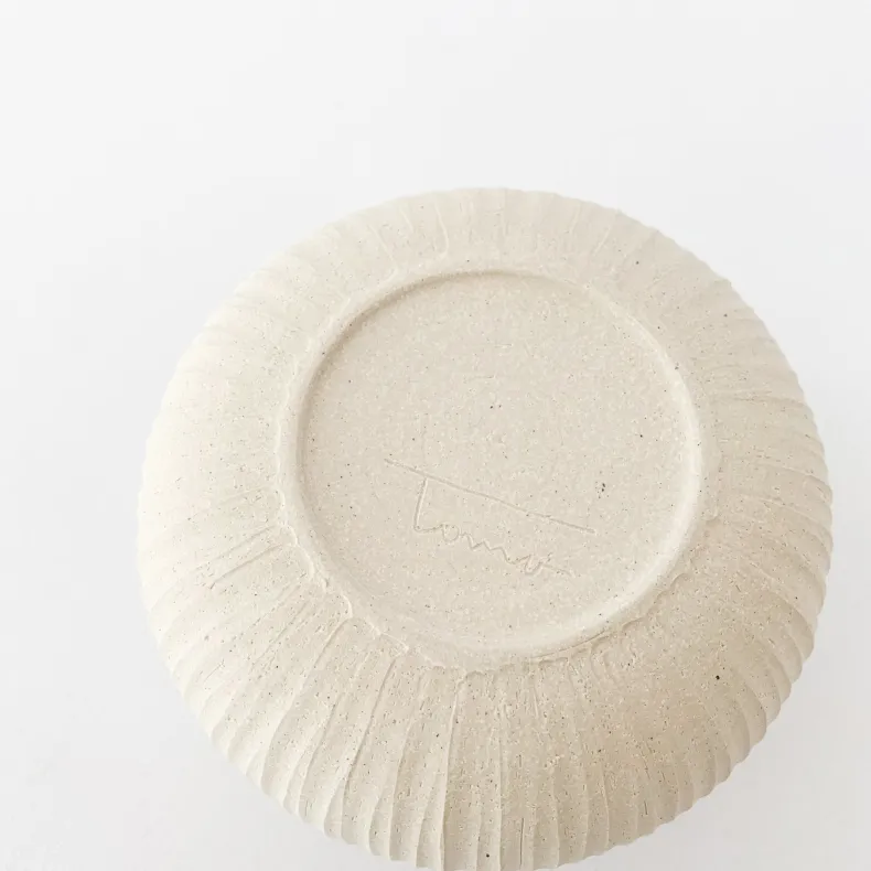 The Shinogi vase combines several design signatures of Tomoro Pottery. “Shinogi” refers to the ridged pattern covering the vase, a technique that Morisaki often uses in her designs. Like all Tomoro Pottery, this vase evokes forms found in nature. Its round, irregular form is similar to a sea urchin or seed pod. The outside of the piece is unglazed, emphasizing the sculptural form and natural beauty of Morisaki’s clay.
