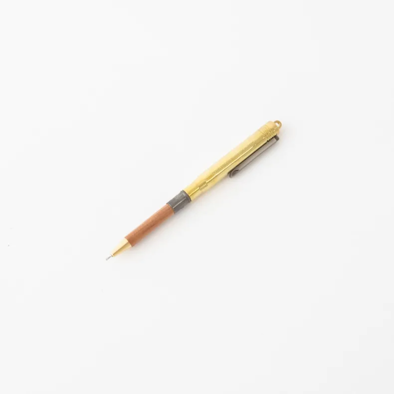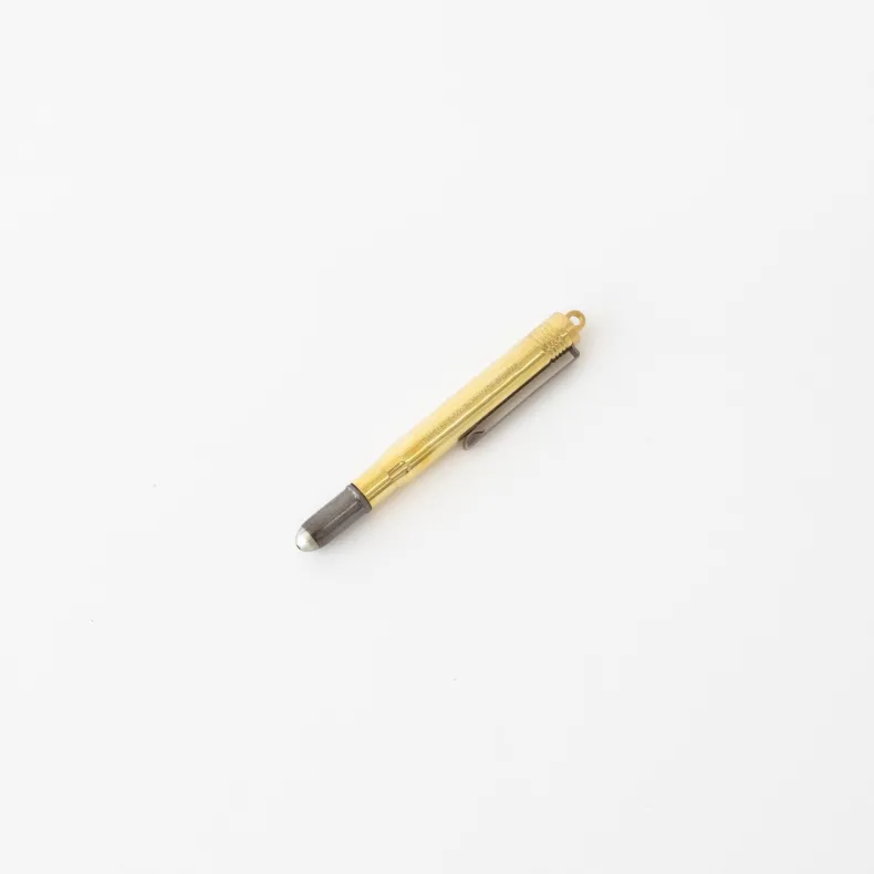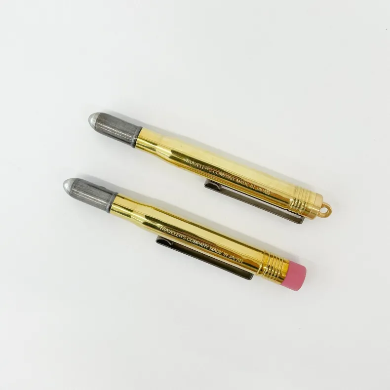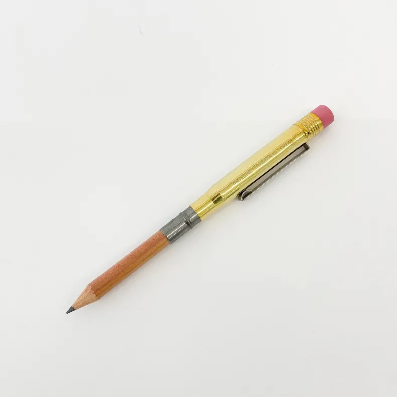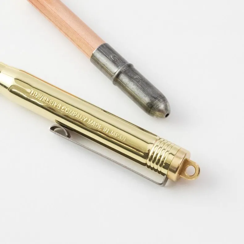 This compactwriting toolactually consist of 2 parts: the brass made holder and the writingtool. When not in use, you can fit your pencil or pen right insidethe brass holder to achieve a high level of portability. Whenneeded to write, the holder becomes an extender so you have a full length writing tool. The additional small ring detail at the top also allows you topass a string or clasp through it so you can hang it on your person, have it hooked onto your traveler’s notebook, or evenuse it as a key holder.