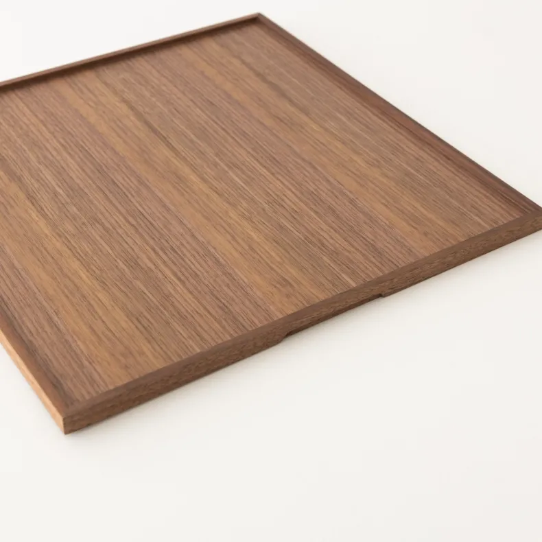 Presented in walnut, these featherlightsquare trays are ideal forservingbeverages, tea, or coffee. They also excel at organizing items on a dresser or providing a stable surface on ottomans or sofas. Their innate simplicity renders them suitable for any interior setting for a wide variety of occasions.