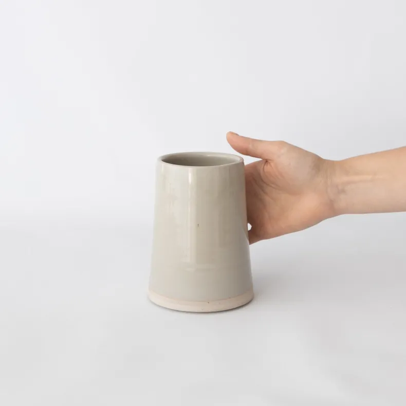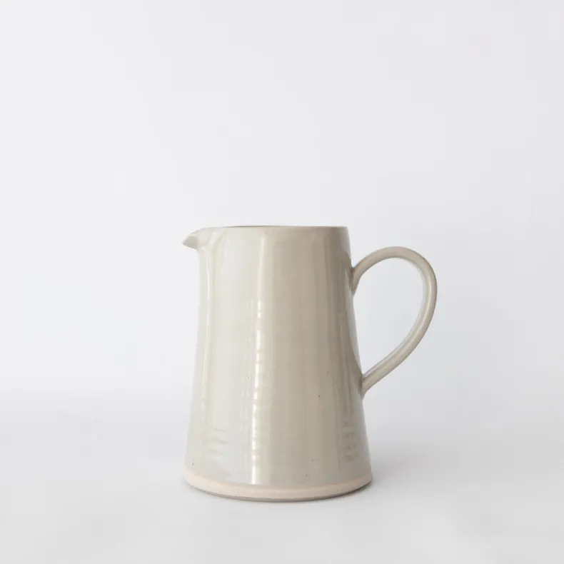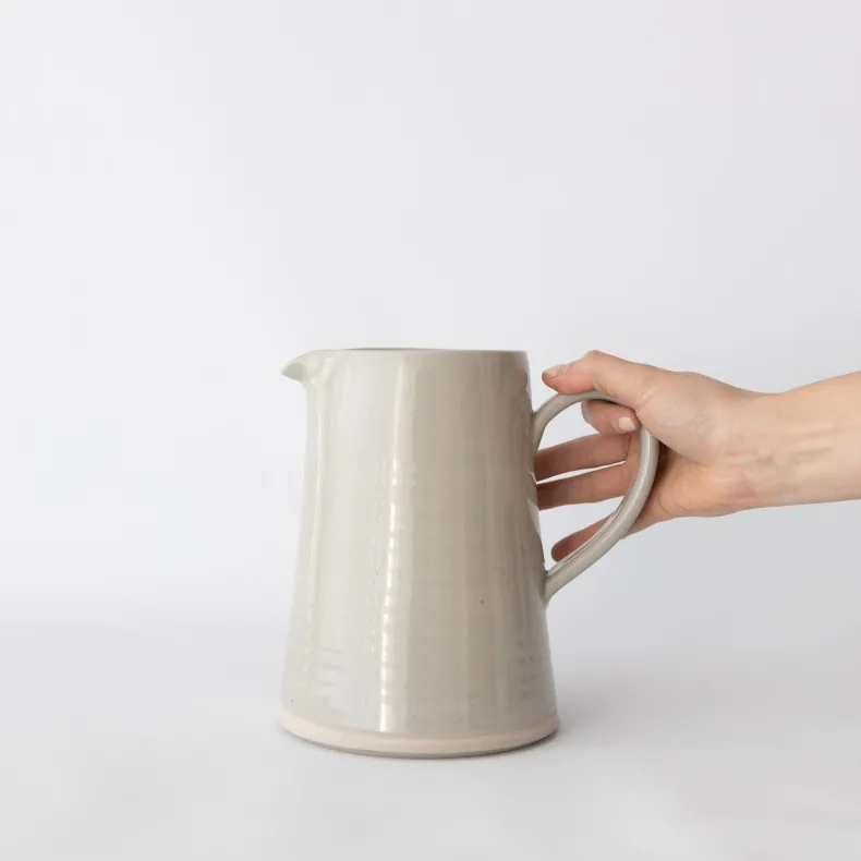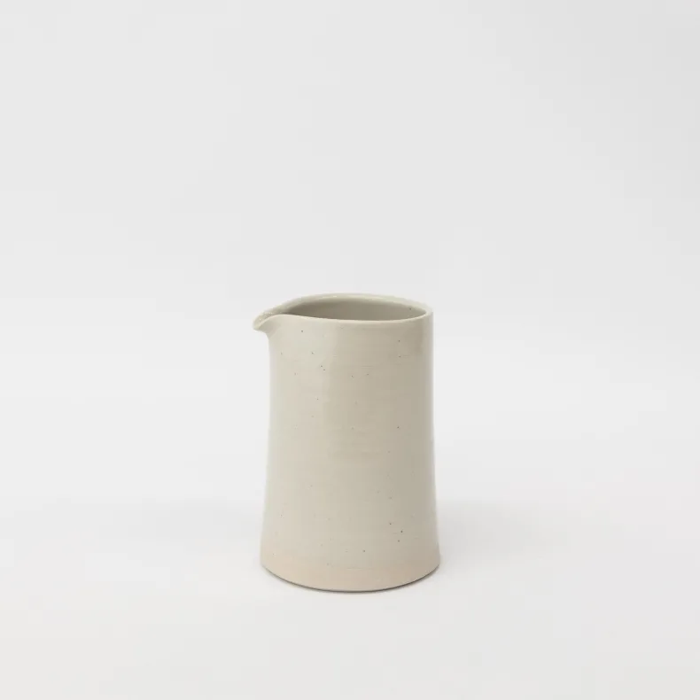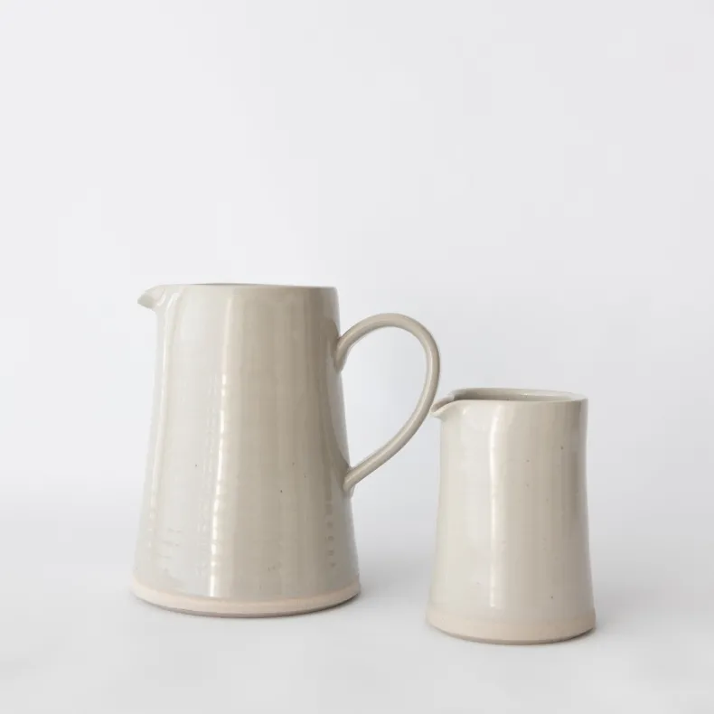 Choose between two sizes of WRF’s handmade pitchers in mist gloss. A spout for pouring prevents messes. The bottom of the pitchers are left unglazed, a signature feature of WRF ceramics. The body of the small pitcher fits comfortably in the handle. The large pitcher comes with a handle. Both gradually taper at the mouth.