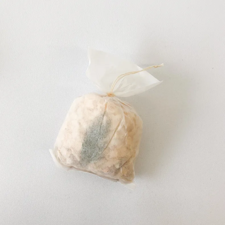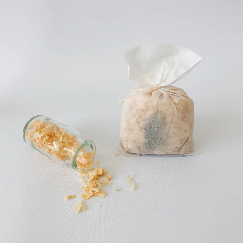 Hinoki Wood Flakes &; Chips + Hinoki Leaf Oil inside fabric bag. This product is 100% Natural Forest Thinning Bi-product.