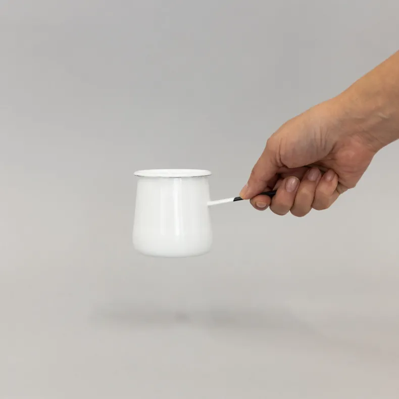 A stylish little butter warmerfromleading Japanese enamelware producer Noda Horo. With a long handle and a convenient spout on the lip, this is the perfect mini pot for heating a tiny pot of butter or milk. Please note: the handle does get hot and be careful to not have the flame exceed the perimeter of the pot or it will scorch the sides.