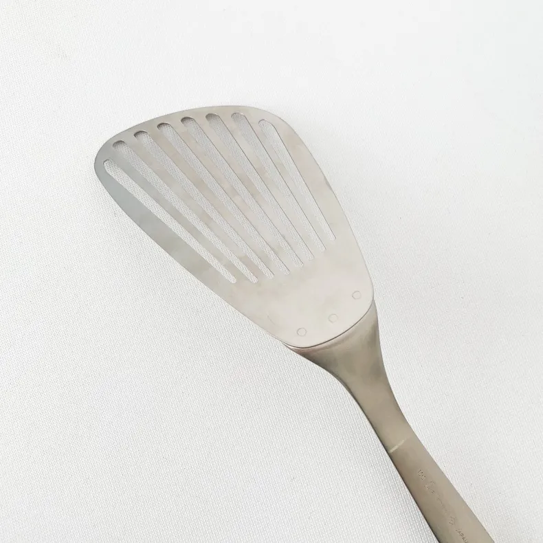 This stainless steel butter beater is part of the Sori Yanagi Cooking Utensils line. This series of ergonomic tools won the Good Design Award in 1998. The curve of the handle provides a strong grip, and the extra thin tip allows for easy flexing to pick up delicate food. Like many of Yanagi’s designs, this piece has a very specific function (beating butter) but can also be used in a variety of other ways, depending on the user’s preference. For example, use this tool to beat eggs, flip fish, burgers, or pancakes. Display the sleek, functional form on your wall by hanging the butter beater from the hole in its handle when not in use.