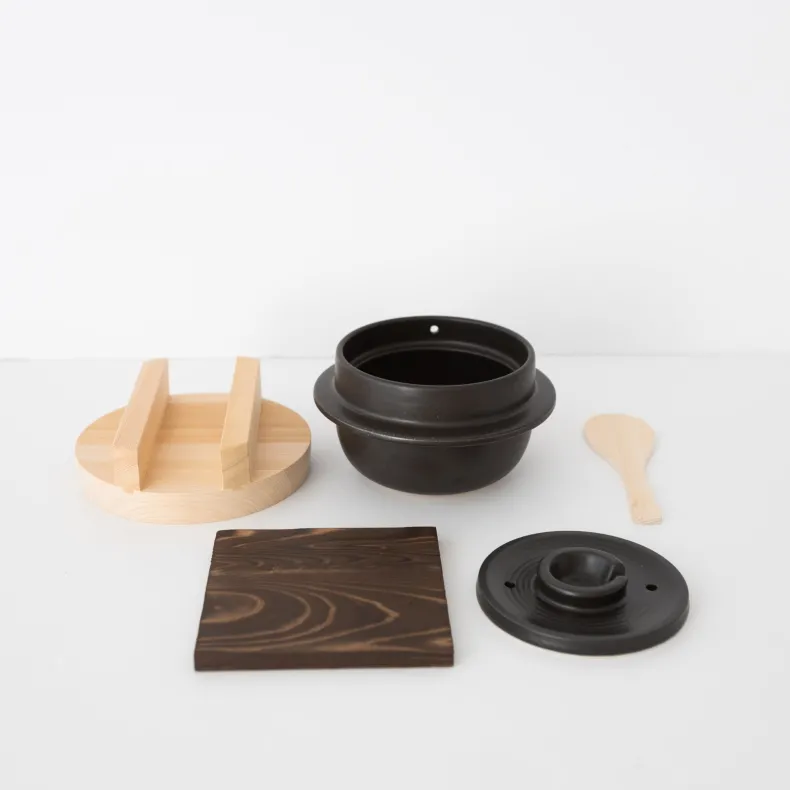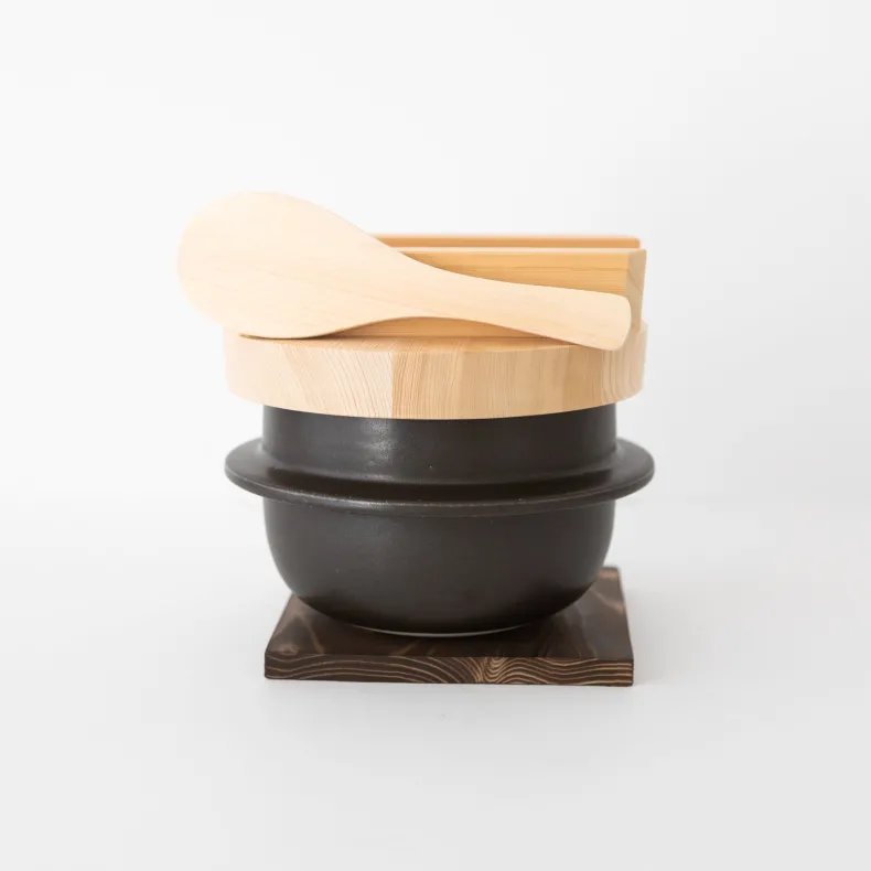 Traditional Japanese ceramic rice cooker, similar to a donabe rice cooker, with an inner lid and hinoki lid, as well as an accompanying trivet and rice paddle. An elegant kitchen tool, beautiful even when not in use, the design and material of this rice cooker ensures heat is spread evenly when cooking, so your rice comes out fluffy and delicious each time. Enjoy the invigorating aroma of hinoki wood when the steam hits the wooden lid as you cook. This rice cooker can also be used to prepare other grains like quinoa, barley, and will work as a donabe pot to cook hot pot dishes, soups and stews. Specifically made for gas stoves only, and the clay pieces are oven safe up to 500 degrees.