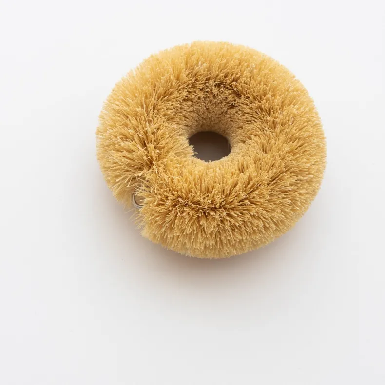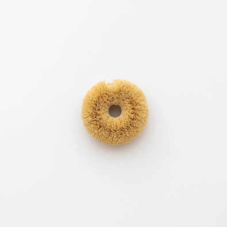 Coconut fiber brush with endless cleaning options. Use it for scrubbing items that do best without dish soap, like cast iron pans, graters, or colanders. Also excellent for scrubbing vegetables to get rid of any lingering dirt. The soft color of the coconut fiber and organic donut shape also make this sponge an aesthetic compliment to your kitchen.